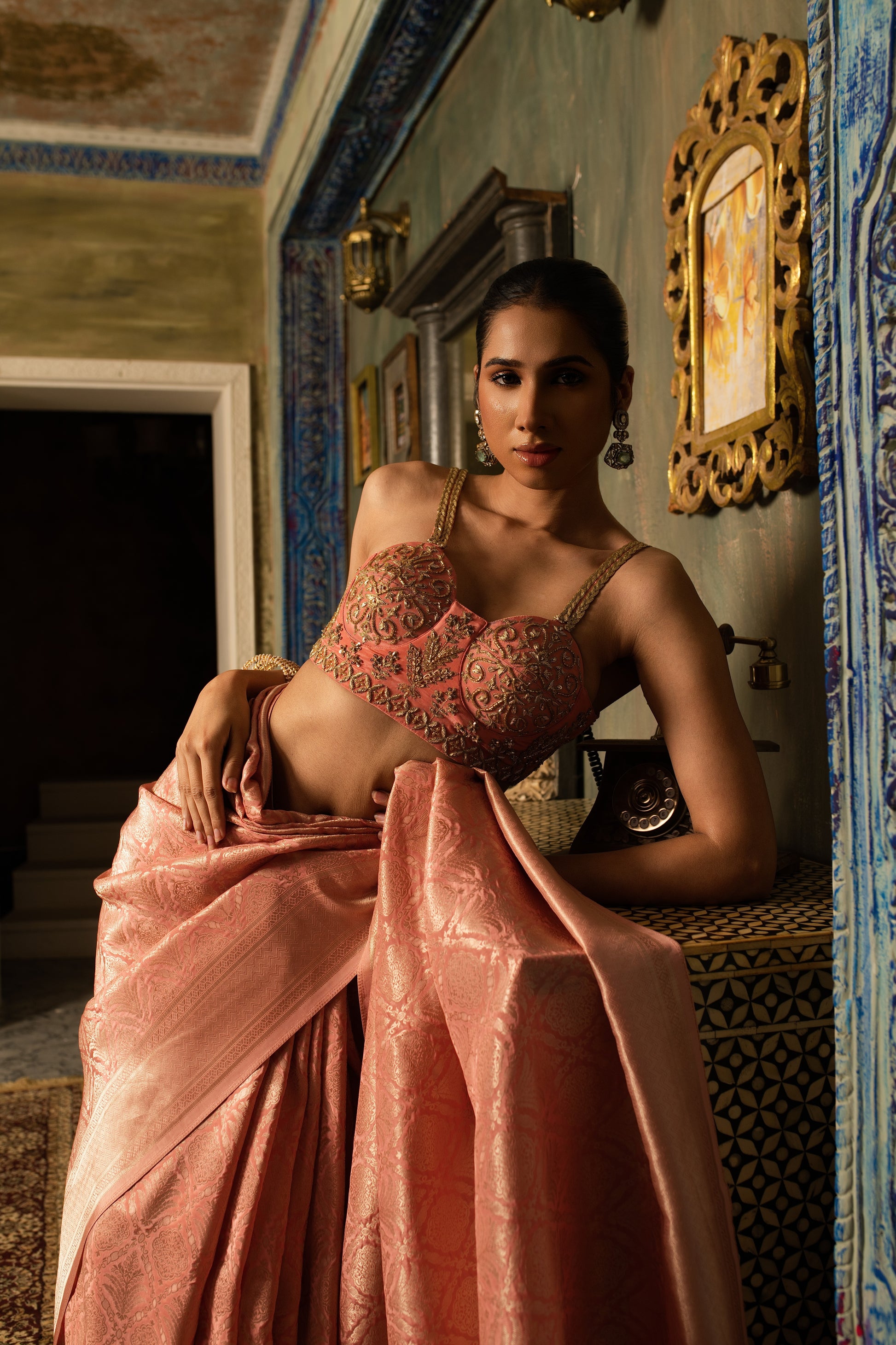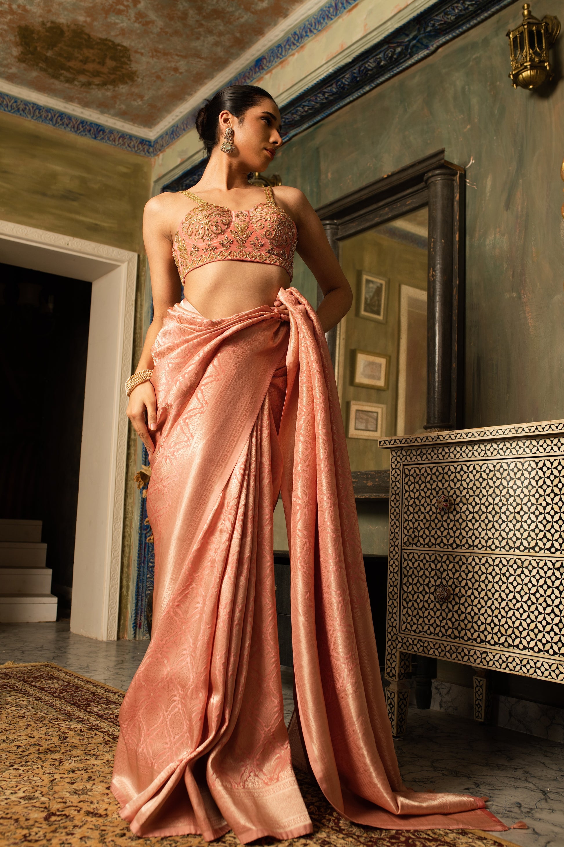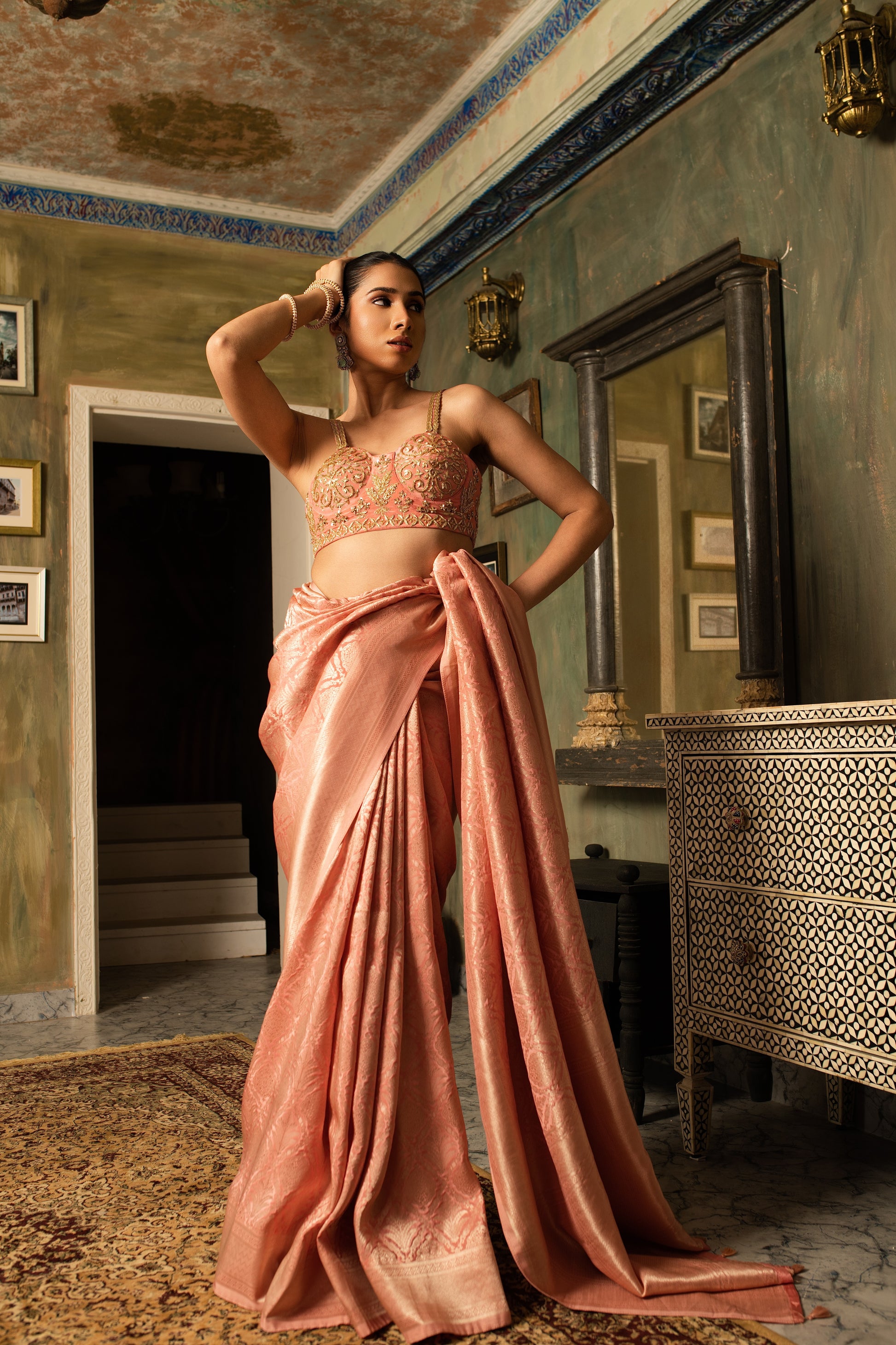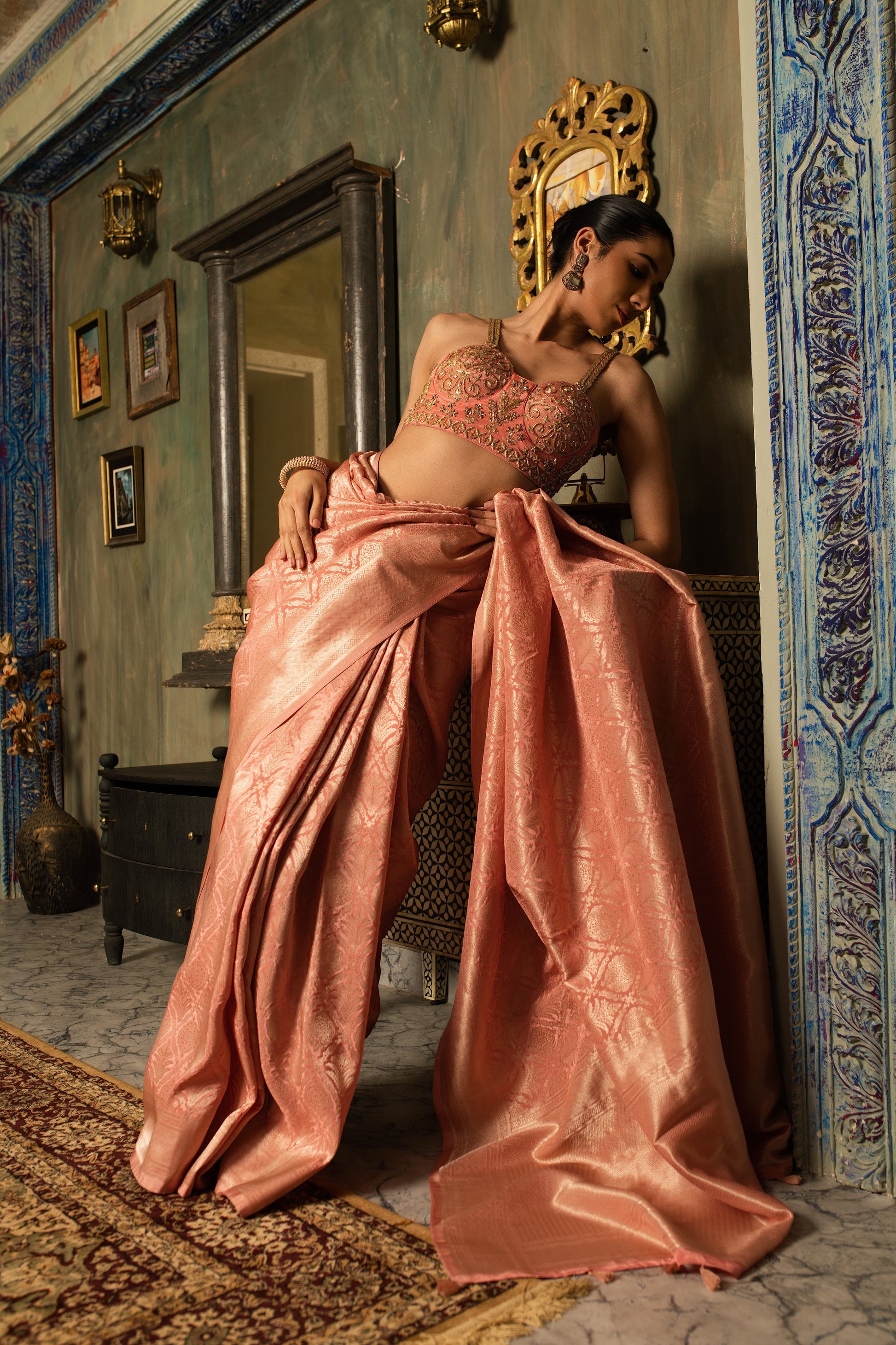 Radiating quiet opulence, this pure Banarasi mashru silk saree shimmers with a natural luster and fluid fall. The copper zardozi blouse adds warmth and regality, bringing together time-honoured craftsmanship and contemporary allure.