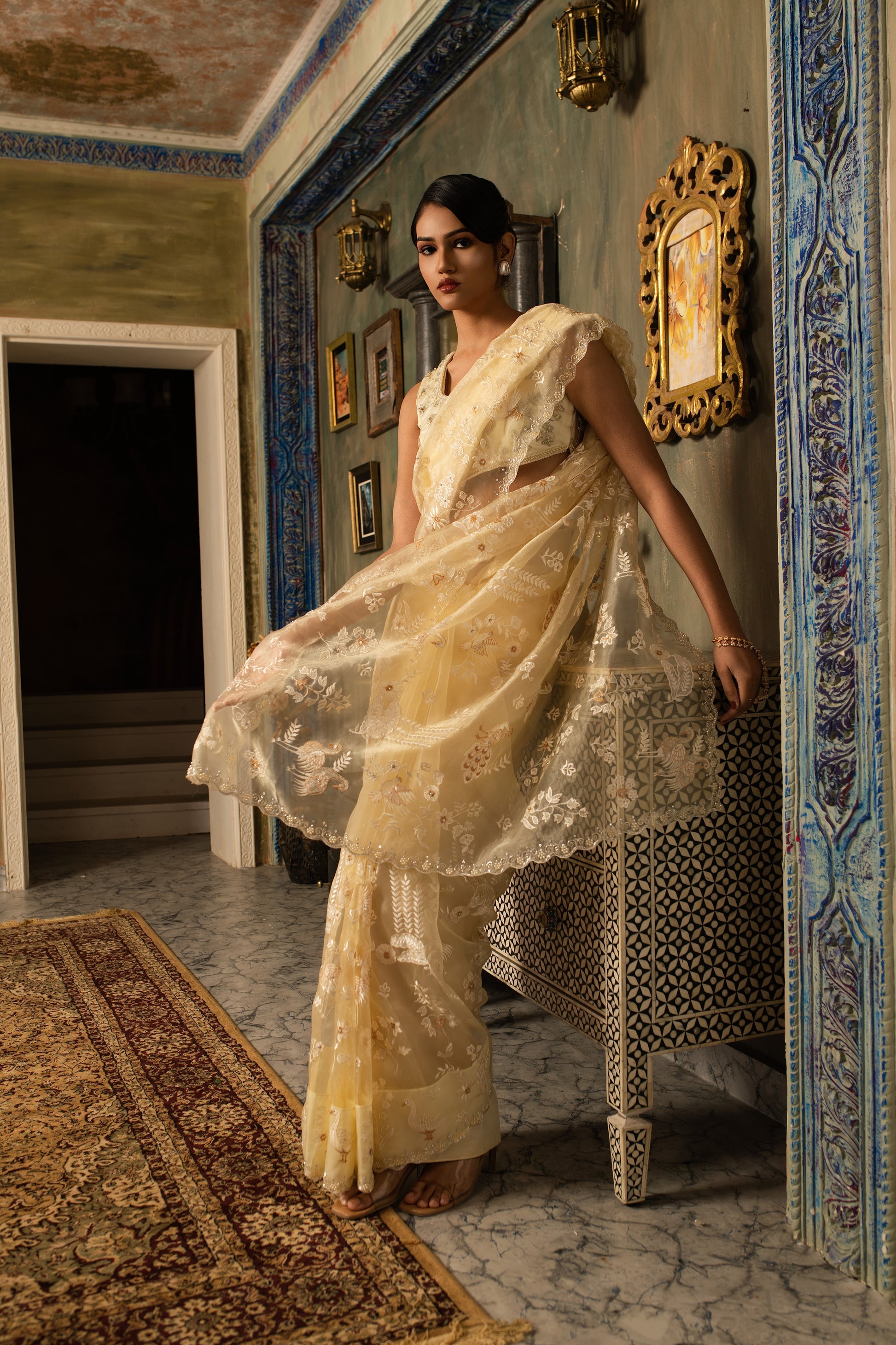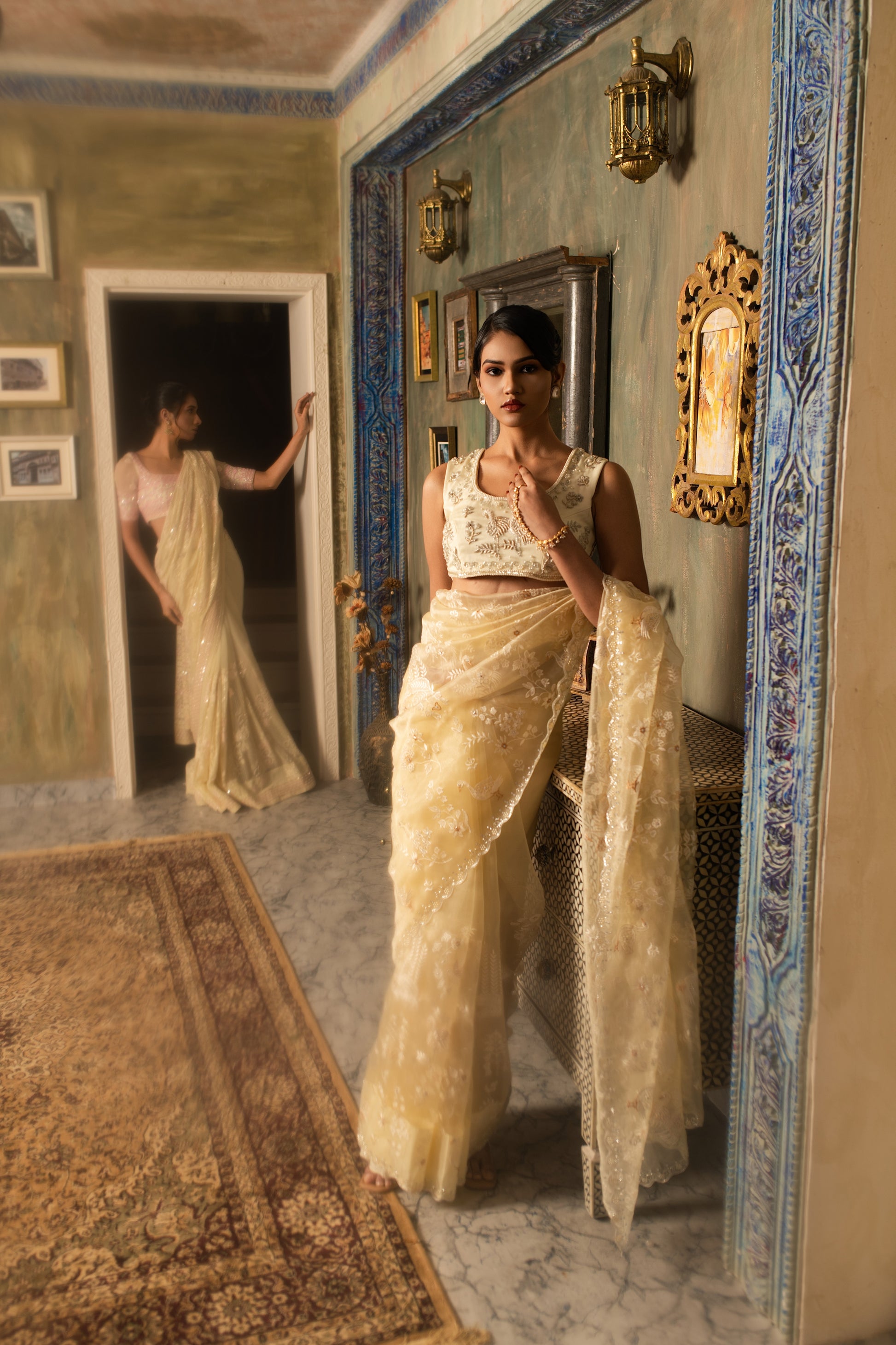 Ethereal and luminous, this pure silk tissue saree captures the light with every movement. Adorned with delicate resham threadwork, it pairs beautifully with an ivory zardozi blouse that lends a touch of understated grandeur. A piece that speaks of timeless grace and contemporary poise.