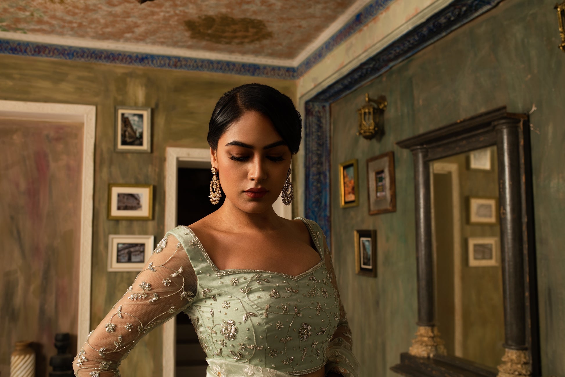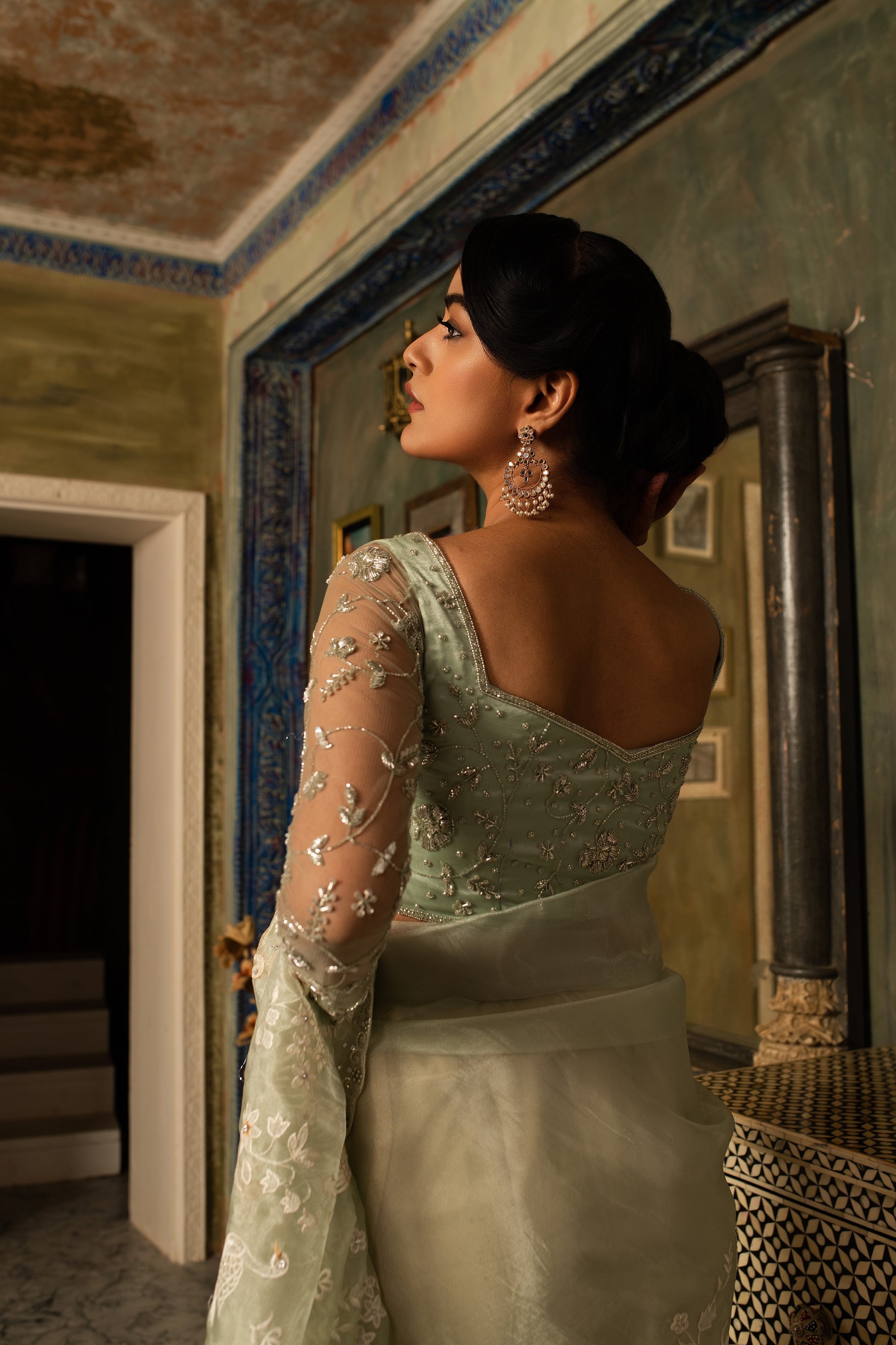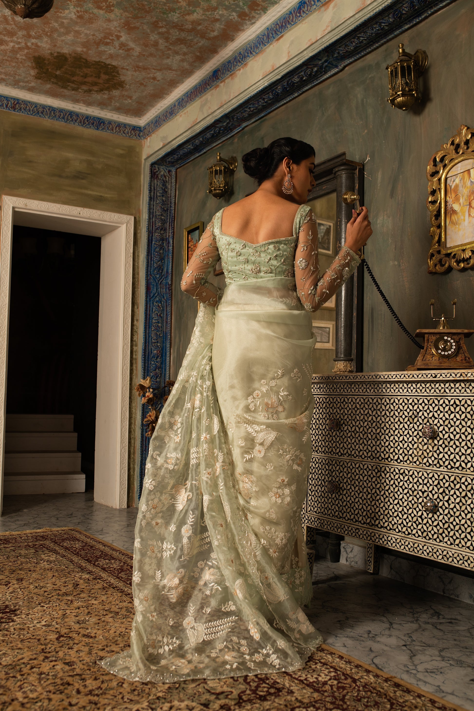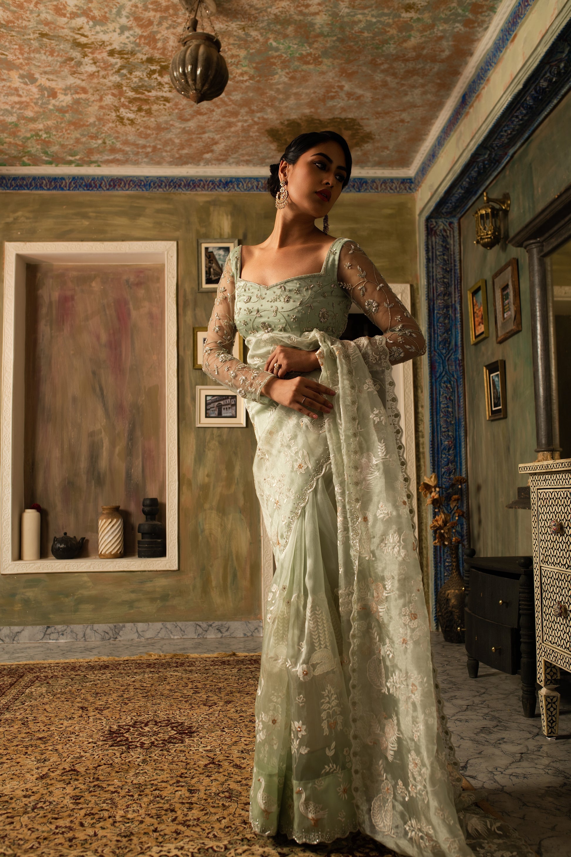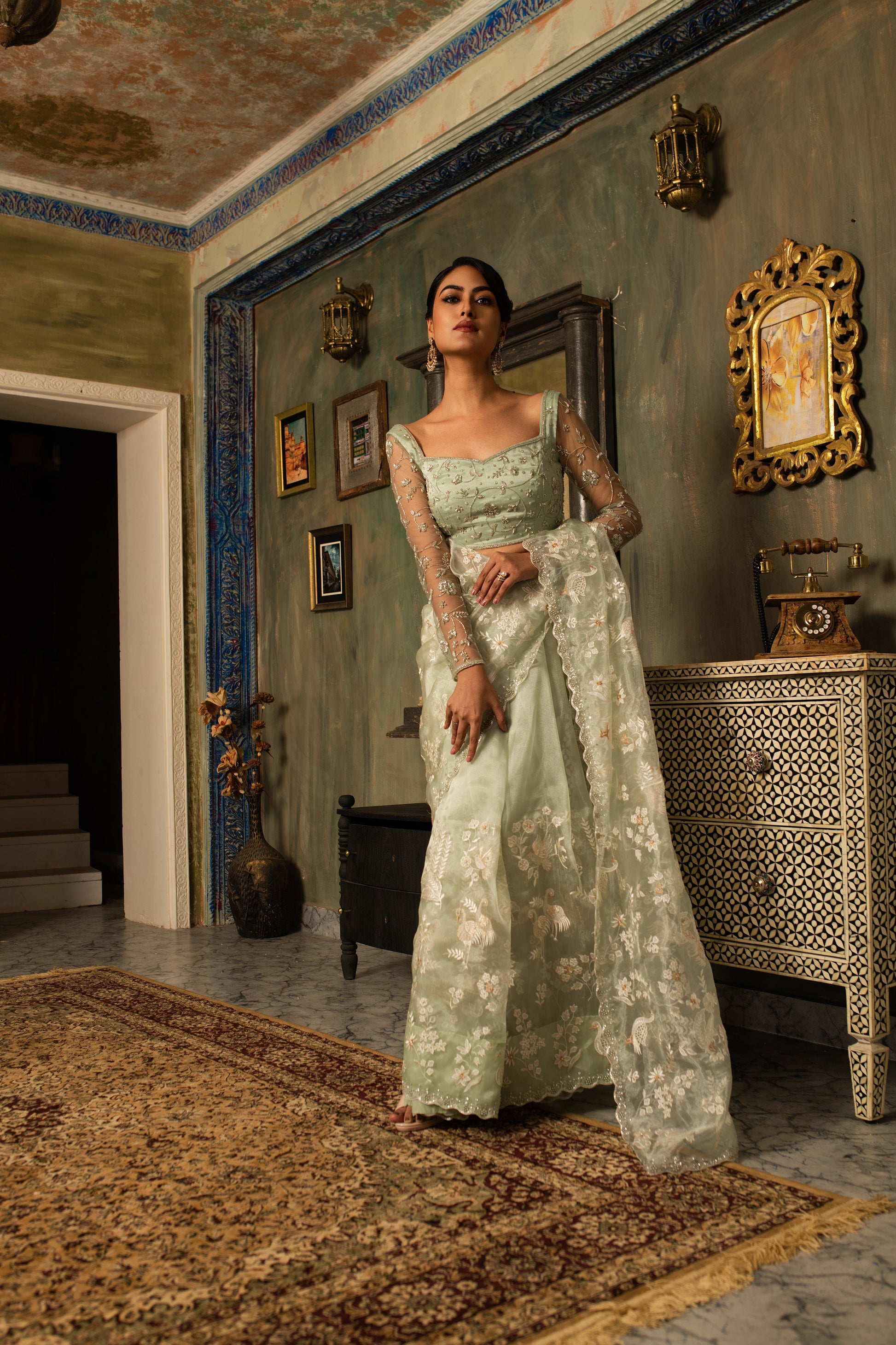 Delicately woven in pure silk tissue, this saree shimmers with subtle elegance and intricate resham threadwork. The accompanying hand-crafted blouse adds artistry and refinement, creating a harmonious blend of traditional craftsmanship and contemporary grace. A timeless ensemble for festive and special occasions.