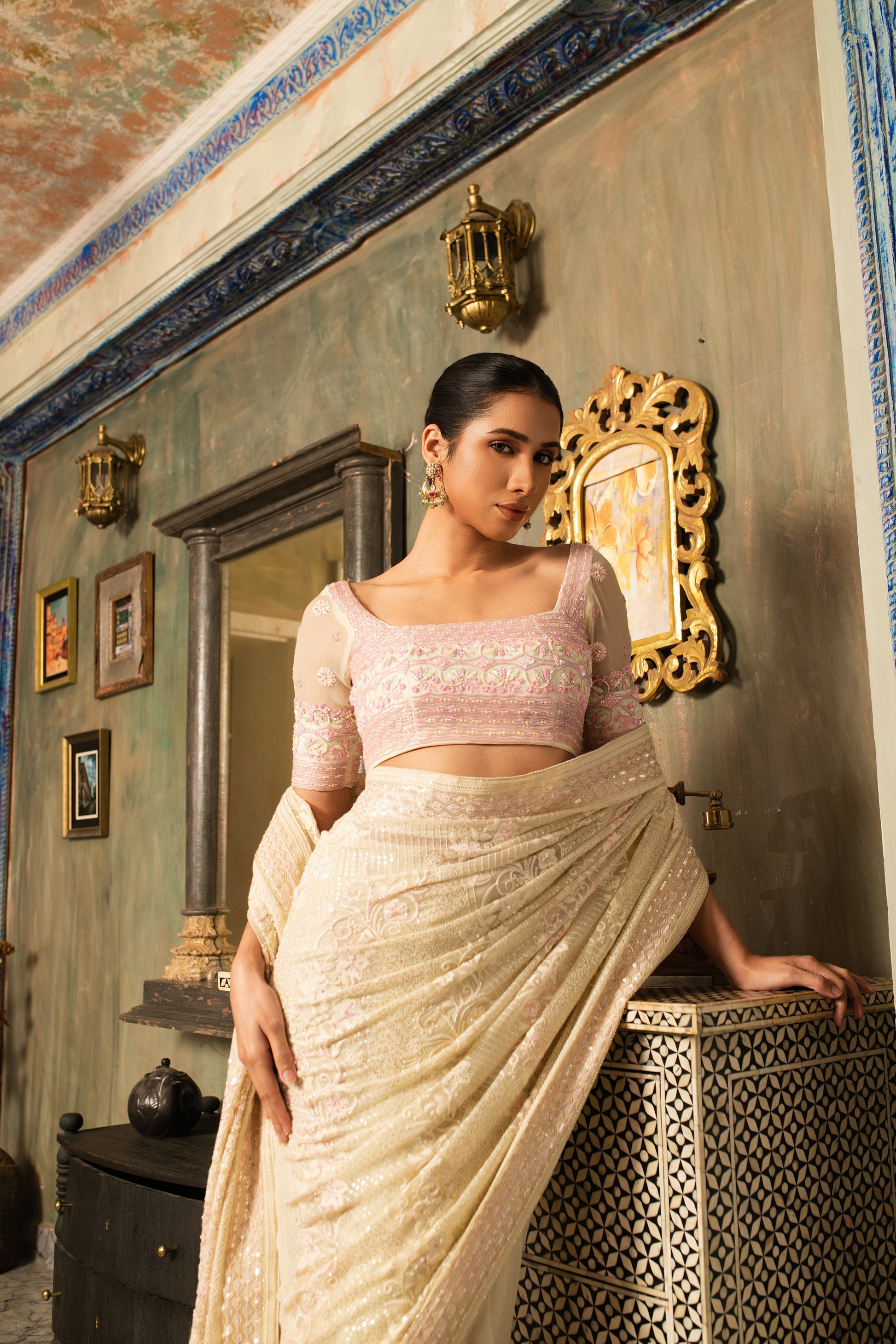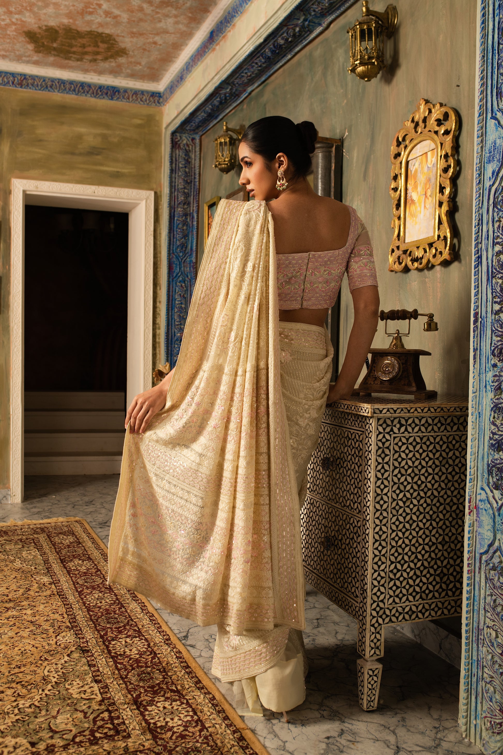 Woven in pure organza, this saree exudes airy elegance, adorned with delicate chikankari handwork that lends a timeless charm. Paired with a contrasting resham blouse, it brings together traditional artistry and contemporary sophistication. A graceful ensemble perfect for festive and celebratory occasions.